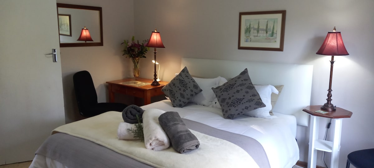 Private en-suite Garden Unit with external entrance and Kitchenette. Perfect for short stays. Wi-Fi, lights and TV during loadshed. Situated in a an upmarket area in a park like garden with external entrance for privacy. Air conditioned room is cosy with a desk/working space. Walking distance to schools, hospital, cafe, show ground. Private barbeque area.