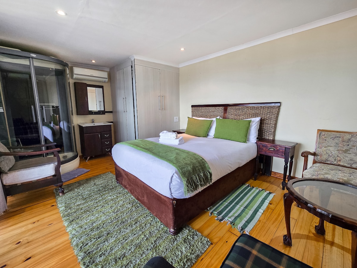 An exclusive beachfront en- suite private room with balcony in a guesthouse. Conveniently located at Supertubes. Amenities include free Wifi, coffee/ tea station with nespresso machine and luxury toiletries. Sun loungers, fridge, king bed and full bathroom with a bath. Access to the equipped kitchen and braai/BBQ area with free firewood ensure a comfortable self catering stay. Walking distance to nearby shops and restaurants.
