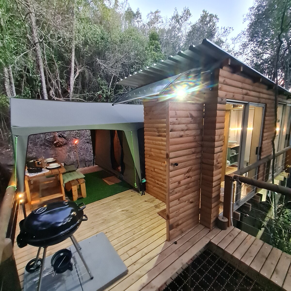 Reconnect with nature at this unforgettable escape. Large safari style tents situated on a raised deck with views of the forest. The tent has two single beds, chairs, power points and a deck for you to lounge on. You have access to 3 choices of bathrooms, some with outdoor showers and another with a bathtub boasting forest views. Use our clean and well equipped communal kitchen as well as braai areas, a bar, a plunge pool/hot tub, plus some beautiful walks into the forests and rivers.