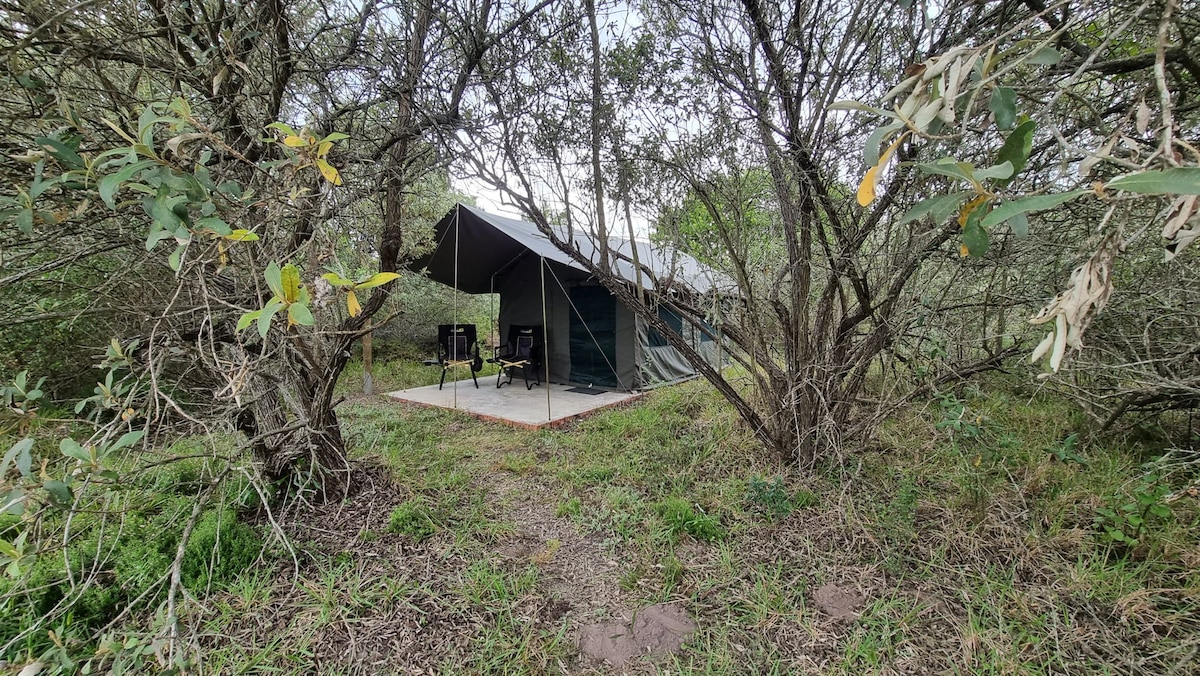 A secluded, secure tented camp located 5 minutes from St Francis Bay. One large and two smaller "Army" tents are nestled in between the indigenous bush overlooking a small pond. All the tents have lights and outlets powerful enough for small devices such as laptops and phones (note that high wattage appliances such as hairdryers will not work). The toilet and shower were designed in a way to incorporate nature into your stay. Remember that bushbuck roam the camp, no pets, and bring a torch!