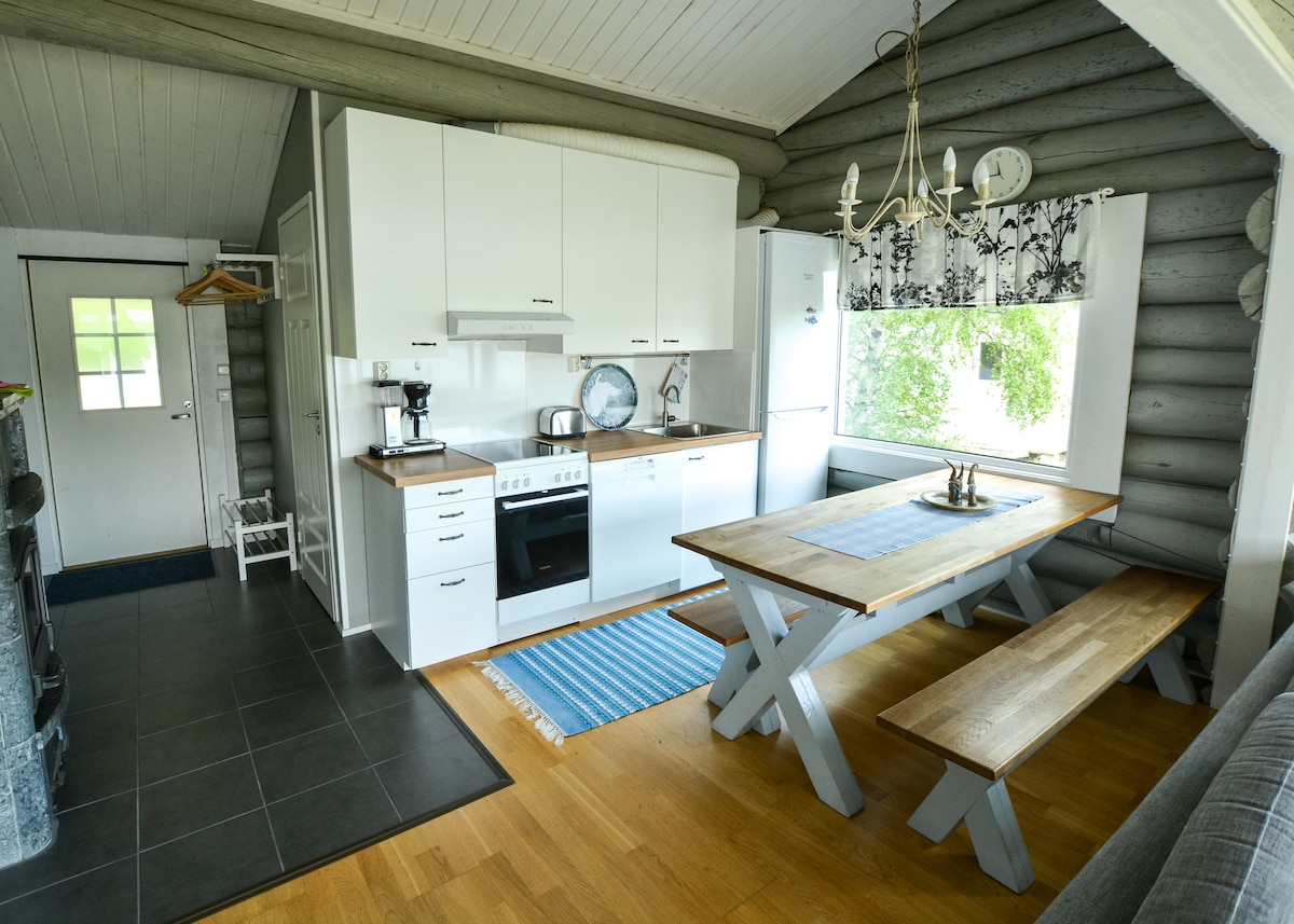 Fully equipped log cottage in Nuorgam, the northernmost village in Finland. Karetörmä has breathtaking views of River Teno. Enjoy the Northern lights show relaxing in the jacuzzi. You have privacy, but the grocery stores are just 5 mins away. Enjoy the winter activities in the Arctic Tundra: cross country skiing, snowmobiling, ice fishing, husky- and reindeer sledding. Make trips to Norway and see the Arctic Ocean. In the summer season, you can go fishing, mountain biking, and hiking.