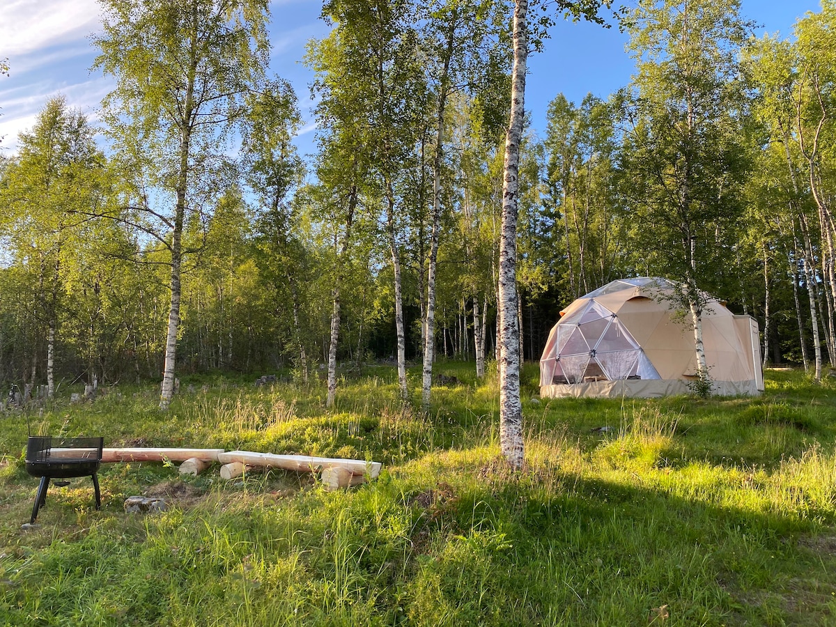 Njut av naturen när du bor på detta unika ställe. Du bor i vårt glamping/kupol tält med plats för två. Egen strand, uteplats, grillplats, vedeldad kamin och underbar utsikt. Maten lagar du över öppen eld eller på en kokplatta i tältet. Du roas av vågskvalpet som vaggar dig till sömns. Ni har tillgång till toalett och dusch i närheten av tältet. Dricksvatten finns i en dunk. Diskar gör du i havet. Inga tillfälliga obokade besök tillåts på fastigheten utöver de två bokade. Varmt välkomna