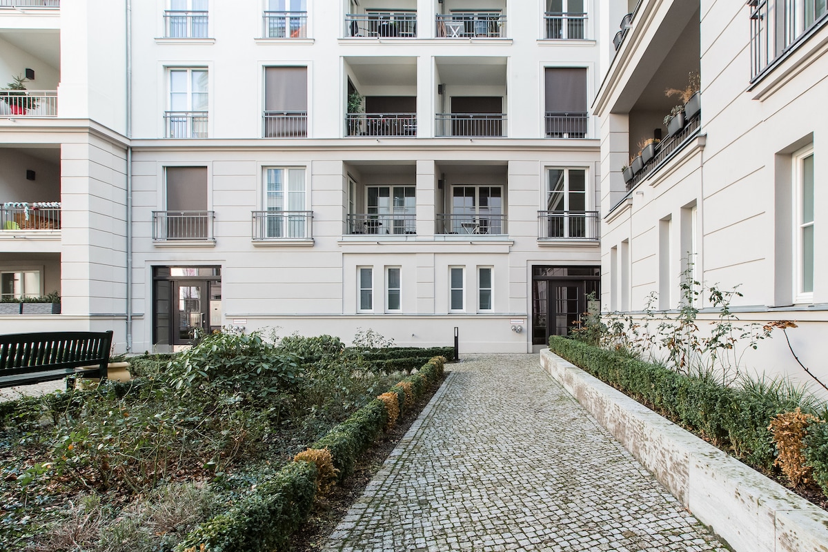 Welcome to this spacious and elegant private suite in the historic heart of Berlin, just a short walk from the city’s most important landmarks, excellent restaurants, and vibrant shopping areas. Enjoy complete privacy, peaceful garden views, quiet sleep, and refined modern comfort. Floor to ceiling windows fill the space with natural light, while a luxurious king size bedroom, a high-end kitchen, and a sleek bathroom with a rain shower and bathtub create a calm retreat in the middle of the city.