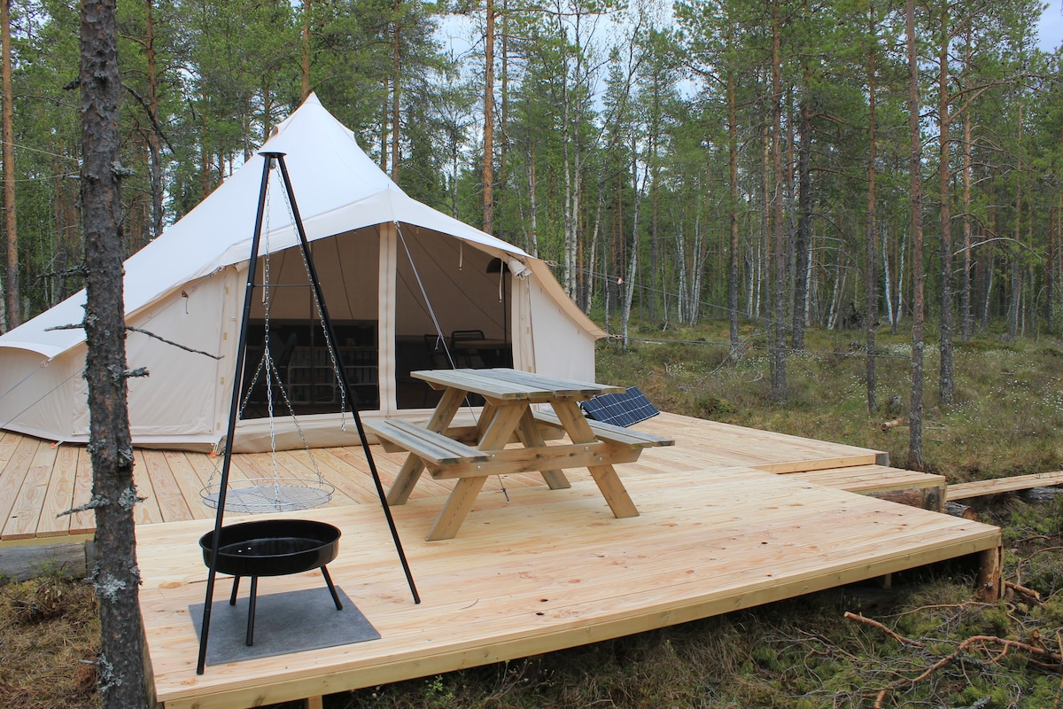 En liten promenad från vår gård hittar du vårt canvastält. Här kan man koppla av och njuta av naturen fullt ut. Lev enkelt, laga mat över öppen eld eller i uteköket som är komplett för att laga frukost och middag. Sängarna är bäddade vid din ankomst med täcken och kuddar. Vatten får du i flaskor för hygien och dryck. bredvid tältet finns ett utedass. 1,5 km bort ligger sjön med brygga och bad, det finns också en fantastisk lanthandel i byn. Cyklar finns att låna på gården. Njut av lugnet