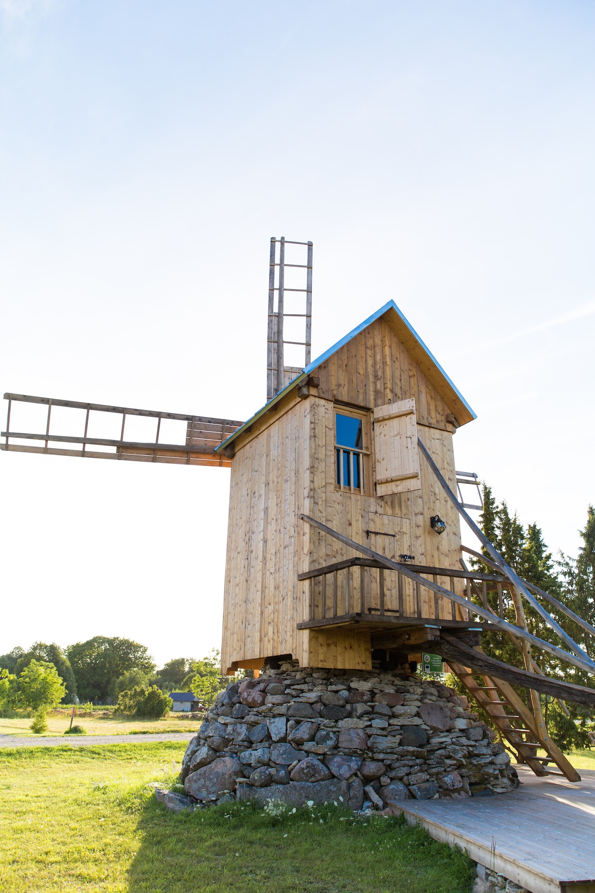 The Suite in the Windmill on the 2.floor ( 2. & 3. floor connected with inside stairs ) with the sea view. Small living room with the sofa bed on the 2. floor & bedroom with 2 dbl. beds on the 3. floor. Fridge. You can use kitchen in the party house & the barbecue place for free. Altogether there are 3 Suites in the Windmill on 4 floors.