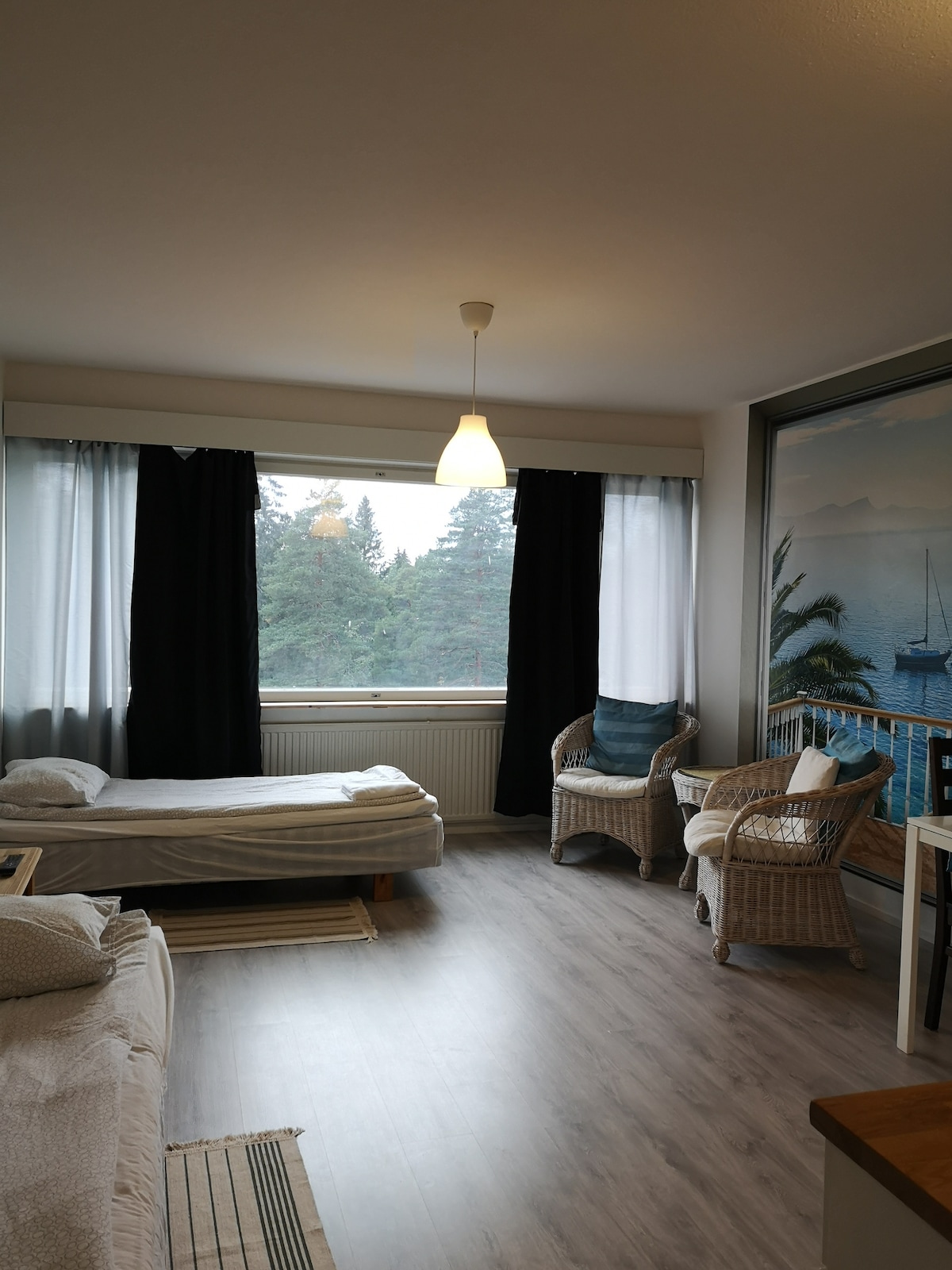 Located at the center of Joensuu, in a peaceful block of flats a bright and nice studio: - Double bed that can be divided into to two separated beds - Car parking place at the yard and a car plug point for car warming - Air conditioner - Washing machine - A wide closet for clothes and luggage - A small bathroom with a shower The apartment is located within a short walking distance from the city center. Walking distance from the railway station is appr. 15 minutes as well as from the University.