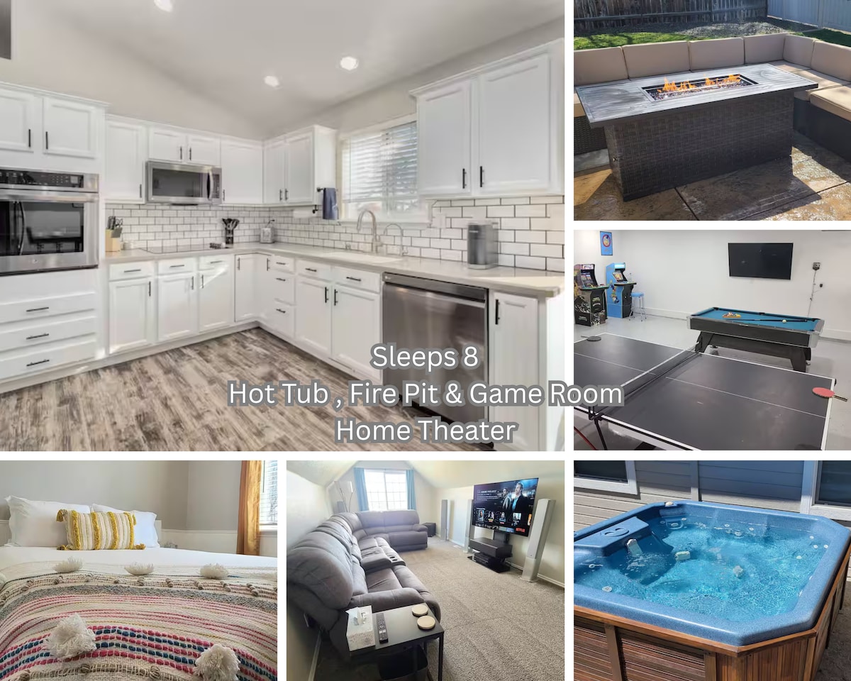 The Modern Farmhouse was recently remodeled with upscale amenities and everything you need for a comfortable stay! Enjoy your own delicious home cooked meals in the beautiful kitchen, gather in the dining room with seating for 8, enjoy a movie on Netflix or Disney+ on a huge 65" OLED 4K TV and 7.2 Klipsch Surround Sound with a large sectional providing seating for the whole family. Outside on the back patio you will find outdoor seating with a fire pit, a hot tub for 5, and a 6 burner BBQ.
