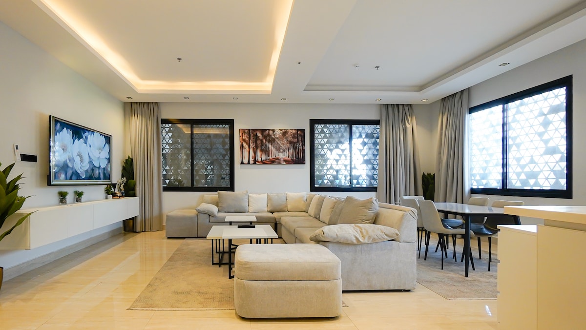 Elegant Apartment – Al-Khazama, Al-Khobar ✨ 🛏 3 bedrooms- 🛋 Spacious living room + Smart TV (Shahid VIP & Netflix) 🍳 Fully equipped kitchen ❄️ Central & split A/C 🌐 High-speed WiFi 🔑 Smart entry | 🚗 Parking 📍 Prime location near Bahrain Causeway, Corniche & malls ✨ Perfect for families & comfort seekers