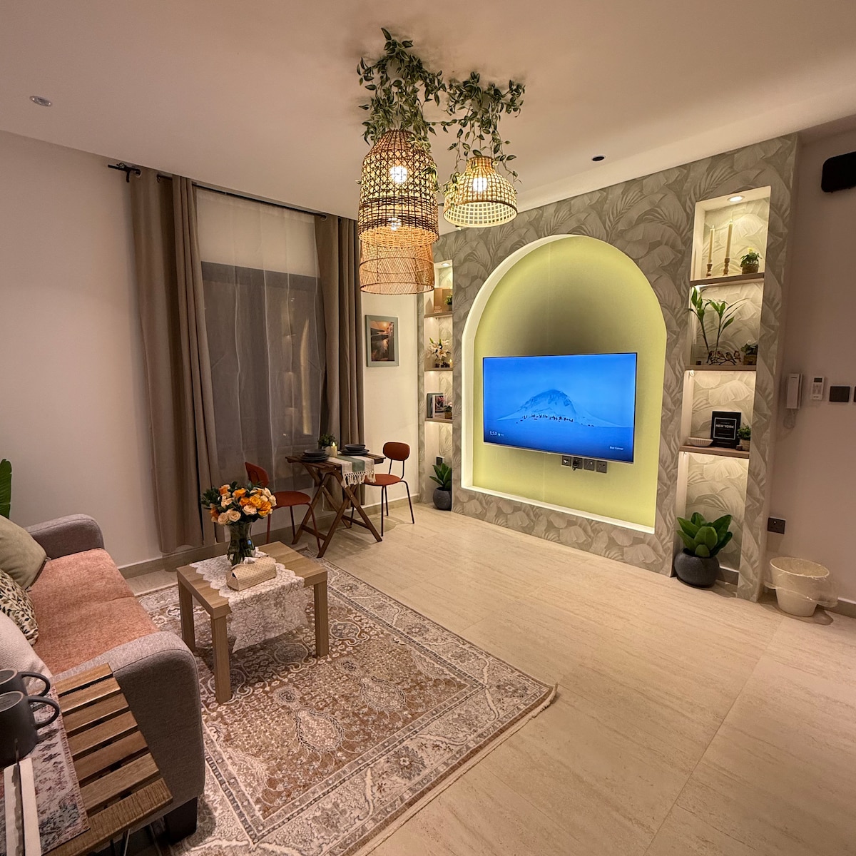 A modern apartment designed for an exceptional stay, located in one of Riyadh’s finest neighborhoods with a stunning view of KAFD. It features an outdoor seating area with a screen and projector for enjoyable evenings. For your comfort, the bed includes a high-quality 14cm extra layer. “We also offer event coordination services for special occasions (including cake and accessories) for an additional fee with prior booking, ensuring an unforgettable experience “