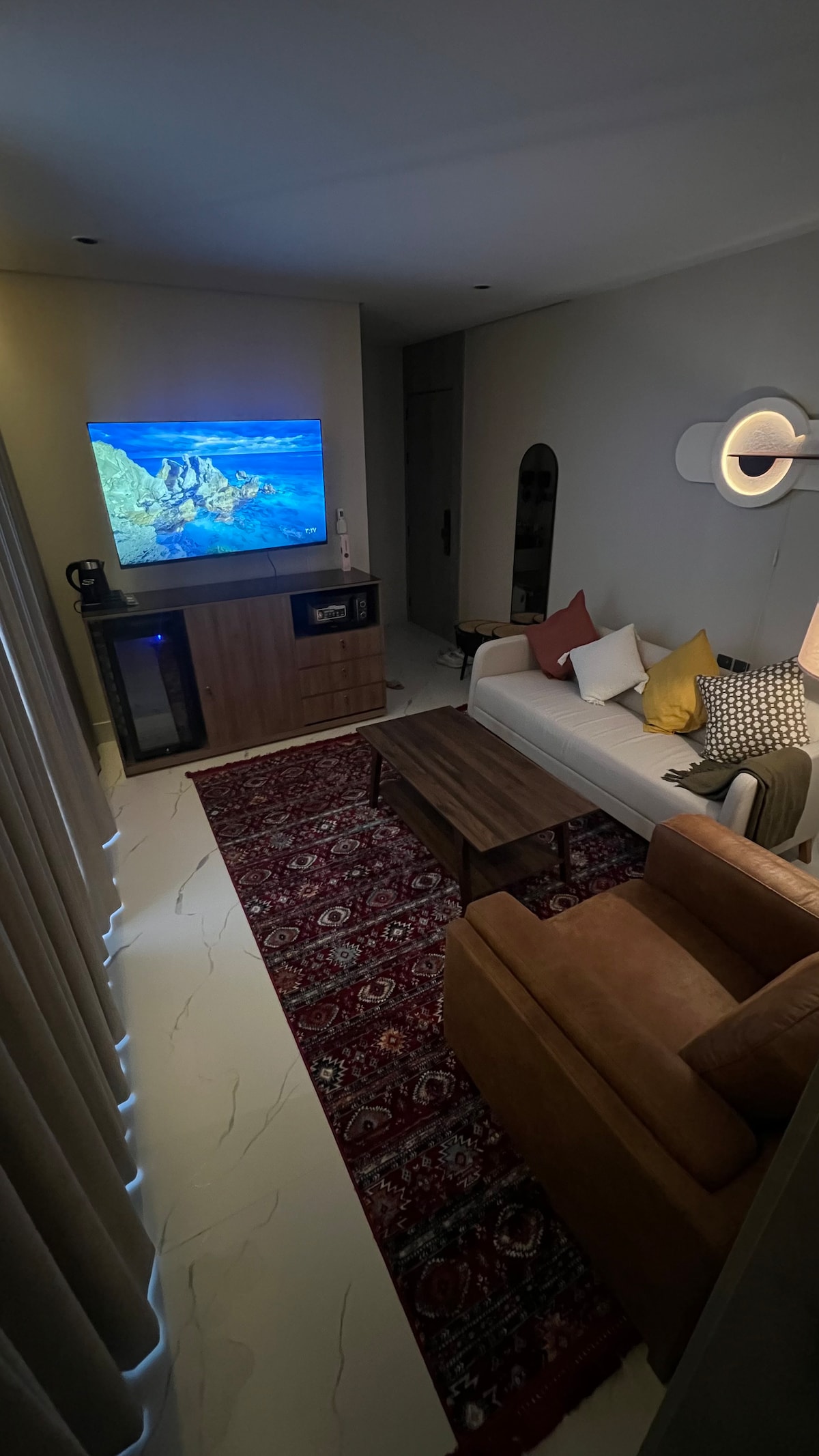 شقة فاخرة في حي هادئ وقريب من البحر، مثالية لمن يبحث عن الراحة والهدوء. تتكون من غرفة نوم مريحة بديكور أنيق وأجواء دافئة تساعد على الاسترخاء. صالة واسعة ومشرقة مزودة بشاشة ذكية لمتابعة جميع البرامج والتطبيقات المفضلة بكل سهولة مع خدمة واي فاي مجانا. المطبخ متكامل بكل ما تحتاجه: ثلاجة، فرن، ميكروويف، غلاية، إضافة إلى الشاي والقهوة لتبدأ يومك بأفضل طريقة. كما تضم الشقة دورتين مياه بتصميم عصري. موقع مميز قريب من البحر والخدمات، لتستمتع بإقامة هادئة ومميزة بكل تفاصيلها.