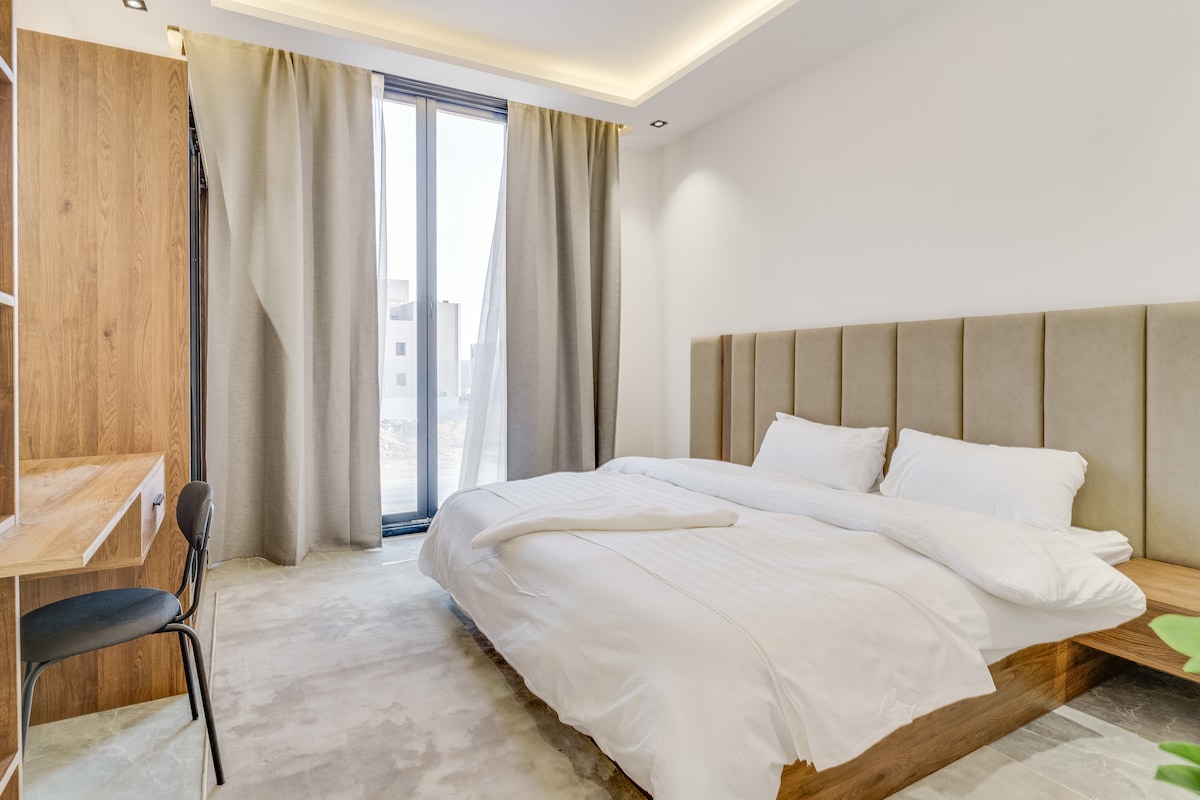 يقع في قلب الرياض النابض بالفعاليات بالقرب من البوليفار والمطار والكوفيهات والمطاعم المميزة صُممت بالوان مريحه ومتناسقة ويمكن الاستمتاع بمشاهده التلفزيون بشاشة 65 بوصه ومجهزه بميكرويف وفرن سطحي وثلاجة وغلاية.وتتميز بمساحتها الواسعه ومدخلها الانيق البوهيمي وبخصوصية تامة بدخولها وخروجها الذكي.اتمنى لك إقامة سعيده ومرحبا بضيفي.