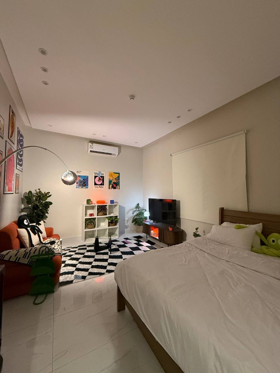 Enjoy your stay in this elegant and spacious studio apartment, designed with modern touches and cozy comfort. The space features: • Queen bed • Smart TV • Comfortable seating • Bathroom — all in one open, airy layout. 📍 Prime Location: • 10 min to Ajdan walk/ Corniche • 6 min to Dhahran Mall • 10 min to Aramco & KFUPM • 10 min to Bahrain Causeway • Only 2 min walk to Flamingo Mall Perfect for business travelers or couples looking for a relaxing, well-connected stay in Al Khobar.