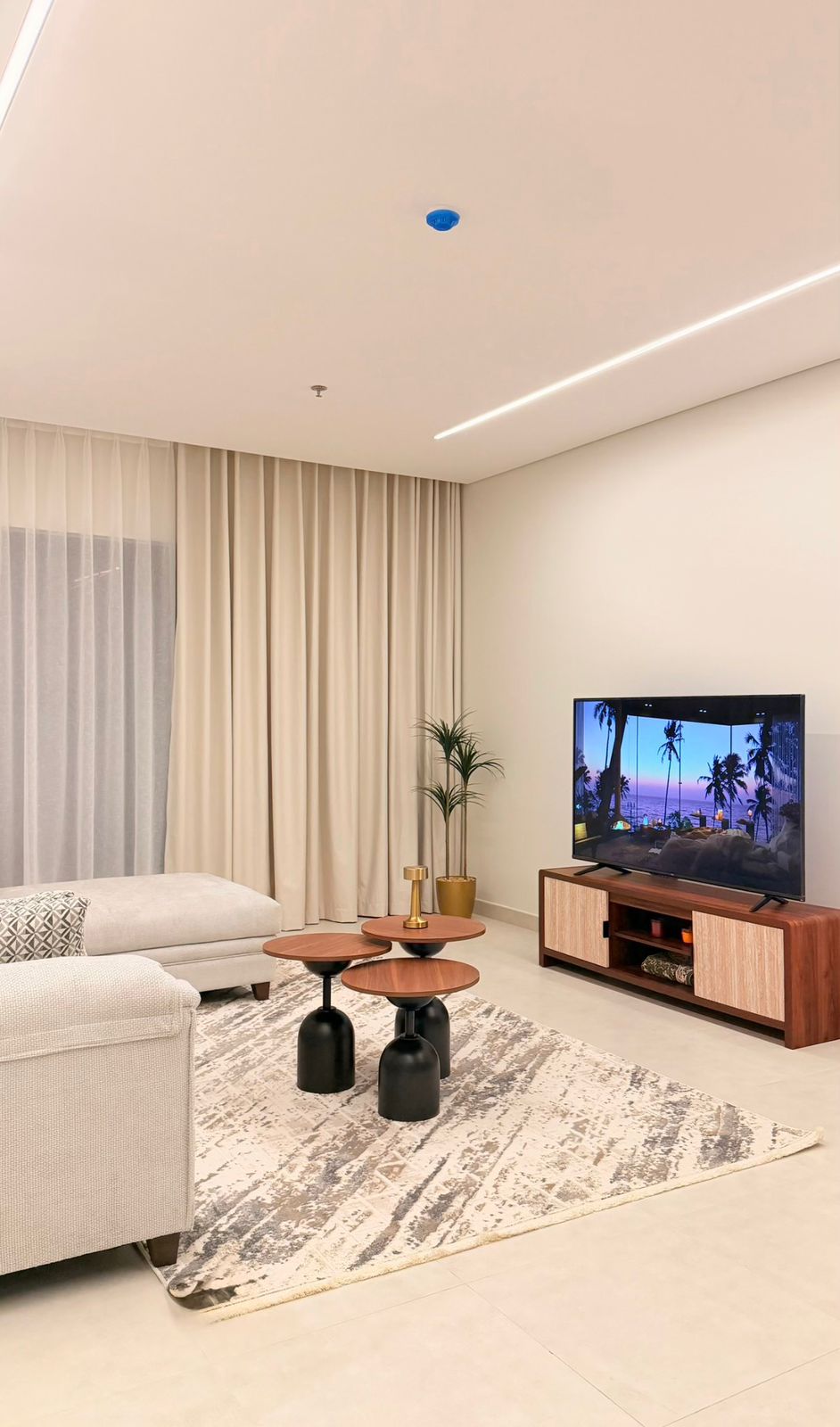 Enjoy a spacious and elegant 2-bedroom apartment with a private balcony offering stunning sea views. Features include a modern kitchen, a large living room, a laundry room with washer and dryer, high-speed Wi-Fi, smart TV, air purifier, and daily housekeeping service. Perfect for families and professionals seeking comfort, space, and a peaceful coastal atmosphere.
