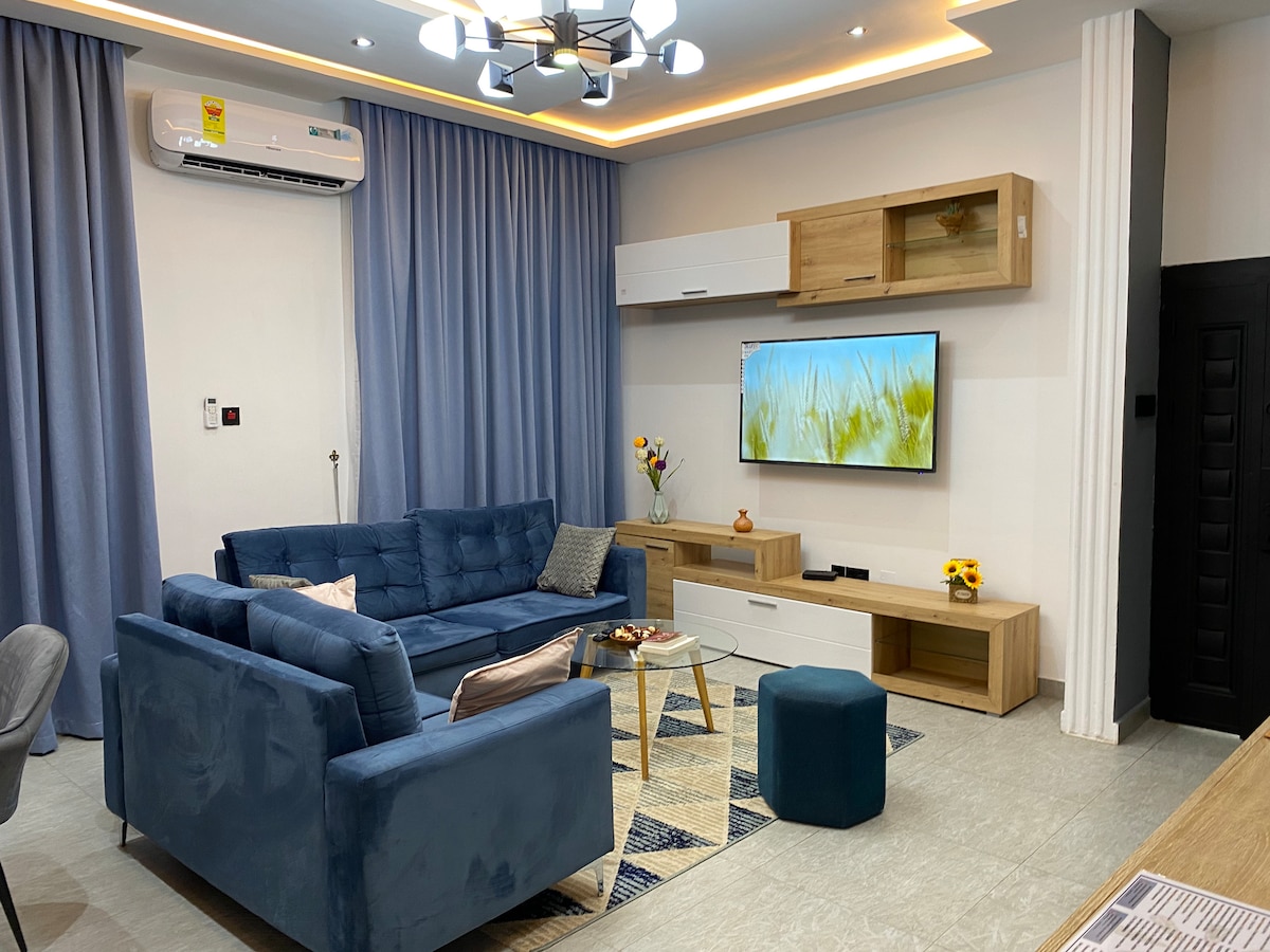 Enjoy a calm and comfortable stay in this cozy one-bedroom apartment with an en-suite bathroom, air-conditioned living room and bedroom, a fully equipped kitchen, private terrace, free parking, TVs in both rooms, and a washing machine. Located in a quiet neighborhood with easy access to shops and transport, the apartment is ideal for solo travellers and couples. A daily prepaid utility allowance of GHS 30 and 6 GB of internet are included. Any extra usage is at the guest’s expense. .