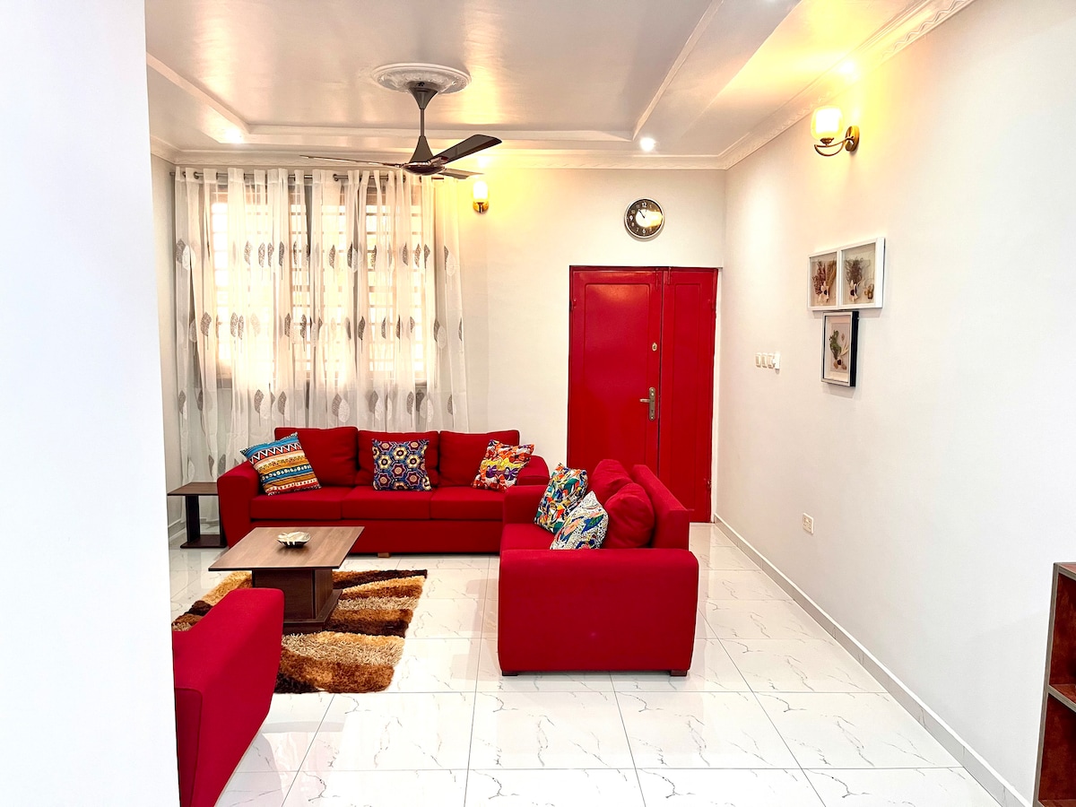 Relax in this spacious 3-bedroom en-suite apartment, perfect for up to 6 guests. Enjoy the peaceful atmosphere while being close to everything you need—fresh fruit, local snacks, and authentic cuisine just a short walk away. Convenience stores, pizza spots, and salons are only 5 minutes by car. Plus, in 15 minutes, you can visit the tranquil Aburi Botanical Gardens in Aburi. A perfect mix of comfort and convenience for your ideal getaway!