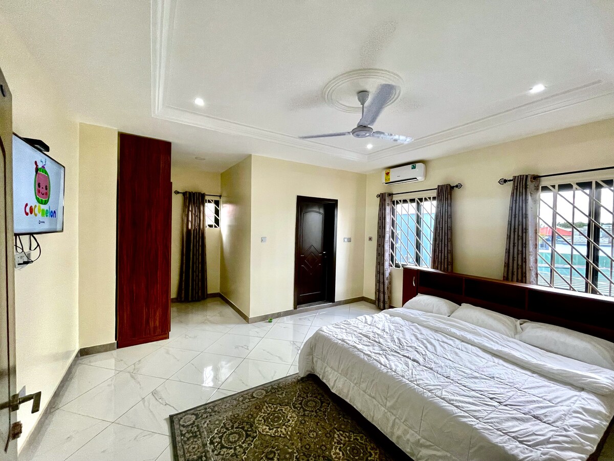 Escape to our serene 3-bedroom house in Lakeside, Ghana! Perfect for families or groups. Each room with comfortable beds and en-suite bathrooms. Fully Equipped Kitchen with modern appliances. Flat-screen TVs and Wi-Fi for your entertainment needs. Enjoy the spacious garden around the house, ideal for kids to play. Close to local attractions, shopping, and dining and less than 5 mins drive to Lakeside Marina Park. Powered by Solar and electricity, so never experience power outage.