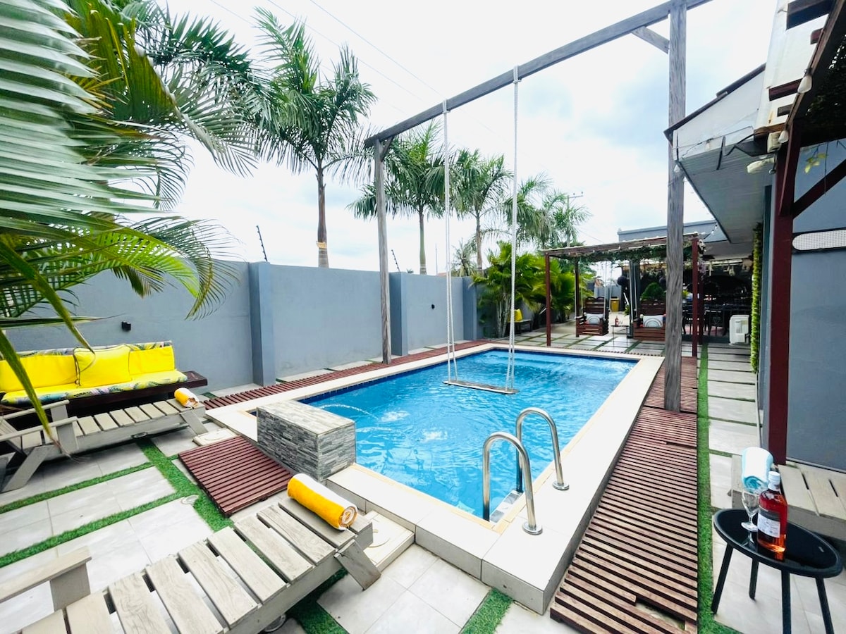 ☞ Private pool with lounge seating (3.5 ft. shallow end, 6.5 ft. deep end, 10x23 pool) 🏊 ☞ Starlink WiFi (250+ Mbps) 🌐 ☞ 24/7 power (solar + backup generator) ⚡ ✭ Cozy King Size Beds (180x200 cm) 🛏️ ✭ Optional chauffeur & chef services 🚘👨🏾🍳 ✭ Daily Cleaning available 🧹 ☞ 3850 sq. ft home ☞ Smart TVs + premium Samsung 11.1.4 Surround Sound Bluetooth speakers 🎬 ☞ Parking (onsite, 4 cars) ☞ Washer + Dryer ☞ Fully equipped + stocked kitchen ☞ A/C 》25 - 30 mins to the airport