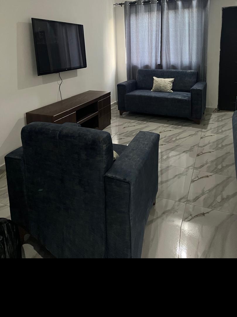 Modern 2BR oasis in secure Danfa community, Accra. 30min from airport(without traffic), 10min from Aburi Gardens. AC, equipped kitchen, washing machine, Wi-Fi, generator, water heater. Peaceful, family-friendly, 24hr security. Perfect for business or pleasure. Book now for comfort and convenience.