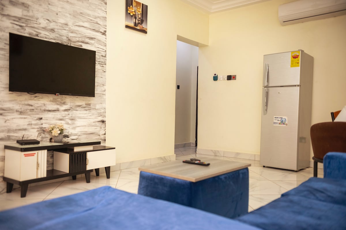 A cool and comfortable suite with a kitchenette in a well planned Gated community with 2000 houses and 24/ 7 security services,a police and fire station,a recreational centre.Guest who love to keep fit can list with the well equipped modern Gym outside the main estate gate. secondly the estate is also very safe for those who would like to jog or walk to keep fit.we have a convenient shop within the house where you can buy your stuff, all these are geared for your comfort and convenient stay.