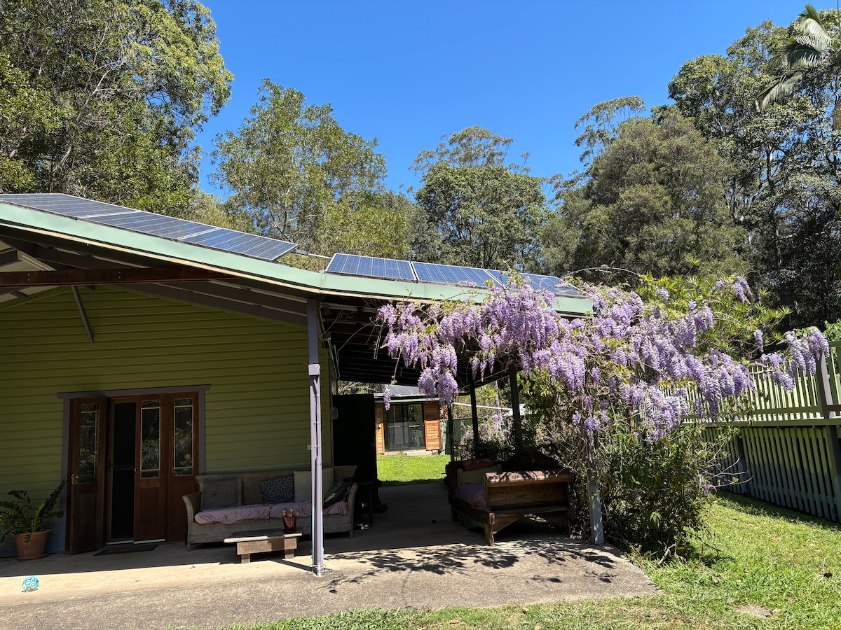 Driving in, enjoy the pretty ponds, trees, creek & bridge, looking out for kookaburras & wallabies. Big 8x8m studio with super comfy bed, kitchenette, cosy fireplace, sun-drenched front porch, smart tv, free wifi, etc, & out the back over some pavers on a lawn, the spacious bathroom/laundry. Beautiful private pool. Relax in abundant nature. Back paddock leads to forest with track to clearing. Tranquil front area. KIDS under16 w'families FREE!