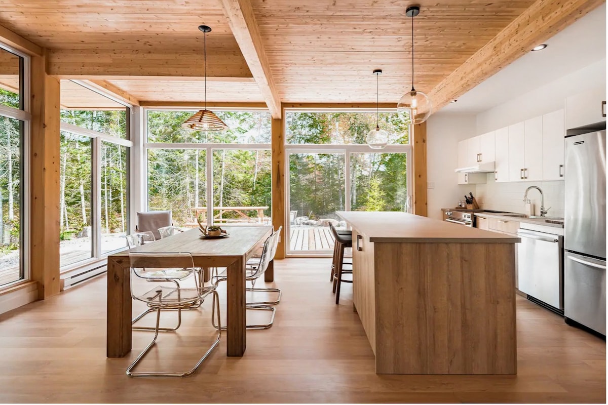 Our Nordic forest chalet is perfect for spending quality time as a couple (or with a kid), or for a work-retreat (with high-speed WiFi). The wooden interior is warm and cozy. The full-height windows offer stunning views over a forested valley. The open-concept kitchen and living room keep you in the conversation while cooking. If you prefer to cook outside, there is a fire pit with a grill and outdoor dining table. Only 70-min drive from Montreal. The lake is a 25-min walk if you park nearby.