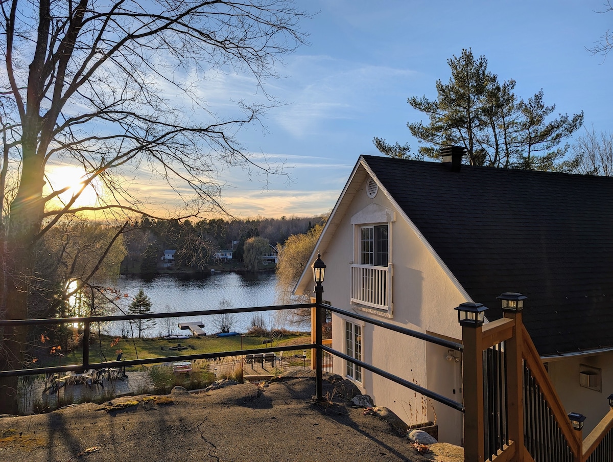 This unique property is right beside the lake, water on 23 sides of the covered deck. Cozy, romantic awesome views and incredible sunsets facing south so sun all day. Bedroom with 8' patio door looking onto the lake and your private covered terrace. Hot tub, 15 steps away. Main floor has full kitchen, two dining areas one looking at the lake. Dogs (quiet and non-aggressive) welcome. CITQ #298403