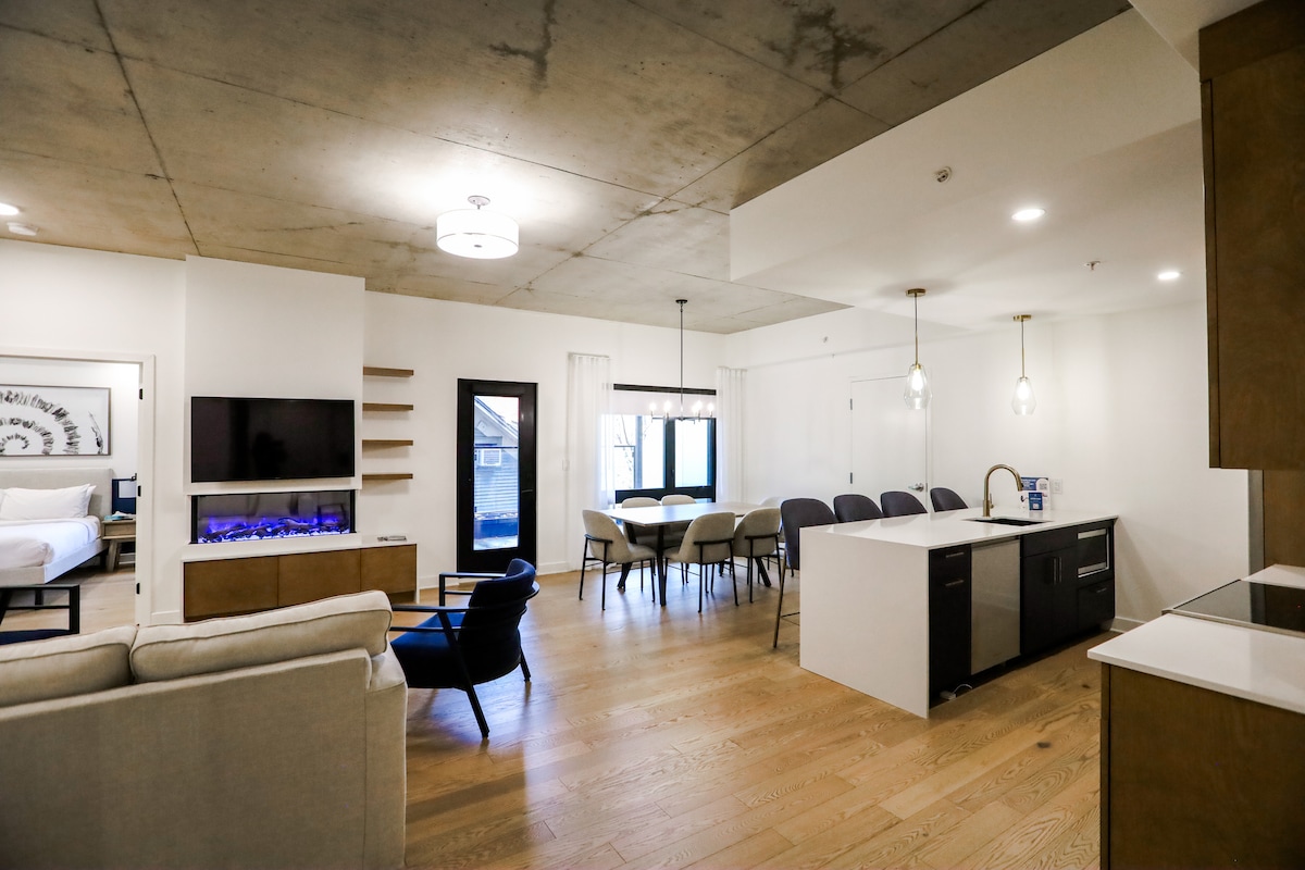 This space is 1 room with shared bathroom. Ultra clean property. Full service Cafe on 1st floor offering room service or sit down. Room features a new King bed, 65" Smart Roku TV, retro inspired mini frig and micro, state of the art sit/stand desk w/high speed WiFi and Ethernet connection, and Keurig coffee maker. Large windows for natural light with top/bottom black out blinds. Individual digital room temp control and remote control lighting.