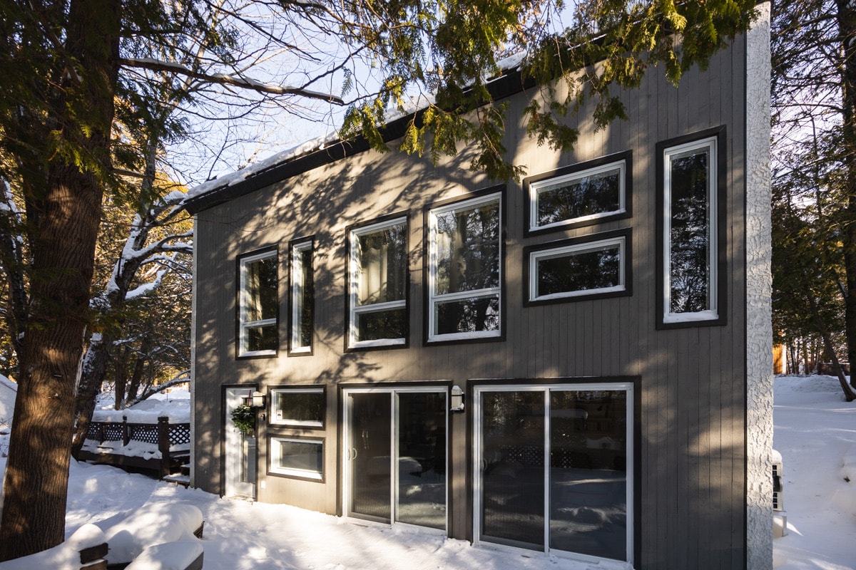 Cosy timeless chalet conceptualized by the architects of _naturehumaine. Nestled into the cliffside at an altitude of 490 meters (1600 feet), its unique design is distinguished by boldness and originality and fits with harmony in its environment. Surrounded by forest, the cottage offers breathtaking views of Mount Glen and the surrounding nature largely protected by the Appalachian Corridor. The perfect silent place to relax and unwind. Photo: Adrien Williams / S.A. CITQ #302449