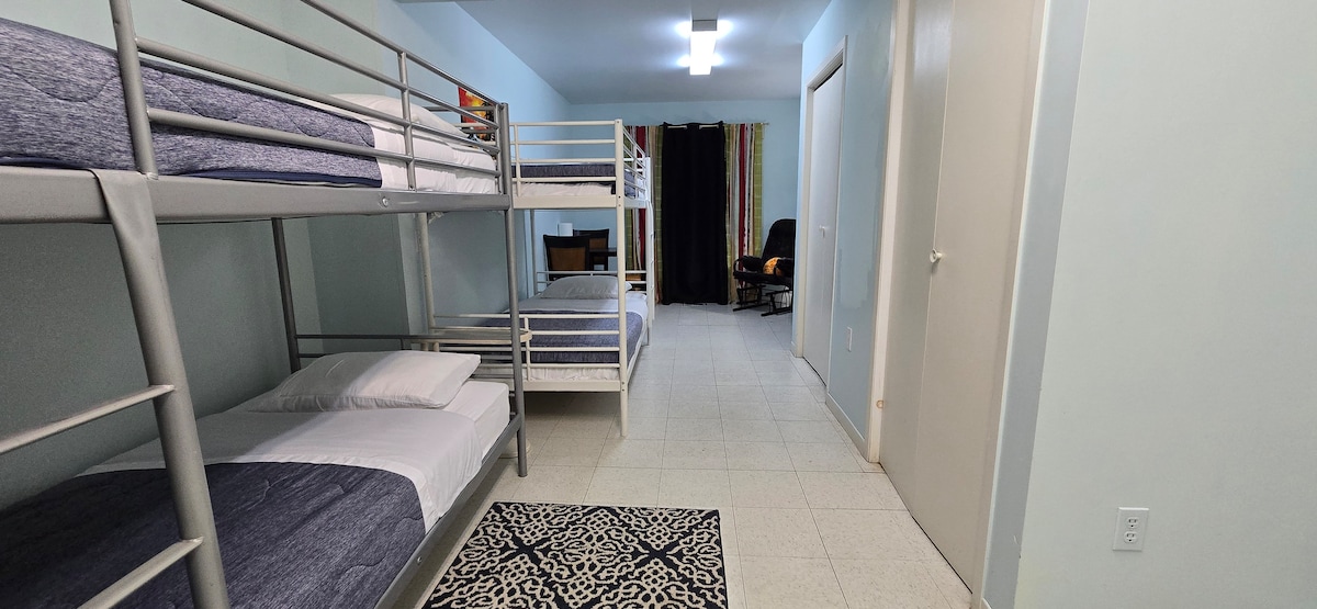 . Le logement comprend 2 grandes chambres et un salon qui peut servir de troisième chambre , une cuisine tout équipée , votre entrée privée , votre salle de bain . Une chambre avec un lit king , un lit simple , une autre chambre avec un lit double , un lit simple et le salon qui peut servir de troisième chambre avec un lit simple . Logement situé a l'étage supérieur de la maison avec tout les commodités .