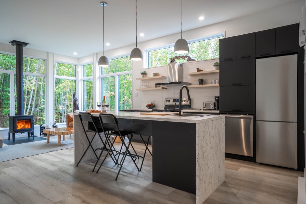 Set in a forest inside the village of Mansonville (Eastern Townships), 1h30 from Montreal, Chalet Creme is a modern chalet with a bright design and amazing views of natural splendour through the large glass windows. Enjoy a meditative sauna experience, snuggle up with a loved one in front of the fireplace or even make yourself a delicious coffee in our fully-equipped & refined kitchen, this space is meant for making memories CITQ #308550