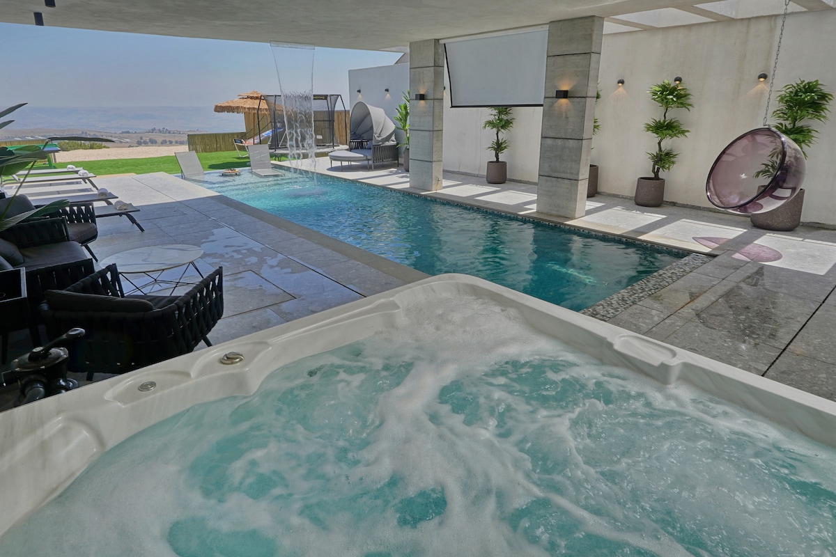 Villa Circle – A Luxury Villa in Nof Kinneret, Upper Galilee 8 beautifully designed bedrooms, a private heated and covered pool with an electric roof and a child-safety cover, a large spa Jacuzzi, wet and dry sauna, and a spacious yard with a barbecue area, pool table, ping-pong, foosball, and a trampoline. Perfect for couples, families, and groups of up to 10 guests – the ideal combination of luxury, privacy, and a breathtaking Galilee view.