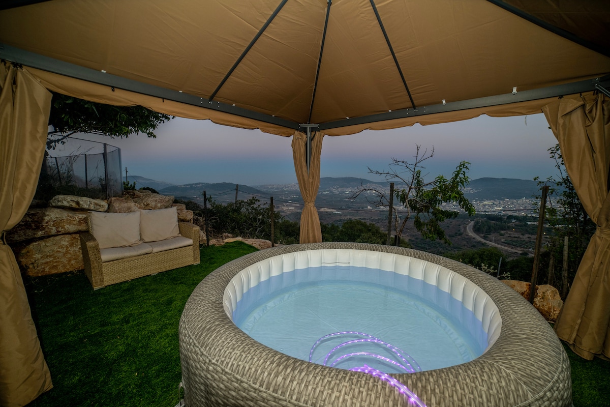 Private yurt in Kibbutz Hanita with Wi-Fi, AC, a private entrance. bathroom. swimming pool available from June to September. There's a large open patio with a breathtaking view overlooking the Mediterranean Sea. Lots of oak trees and a beautiful garden surround the yurt creating a calming and peaceful atmosphere. There is a trampoline, swings on the property. Walking distance away, there are restaurants, hiking trails and caves. small animal farm, and a basketball court.
