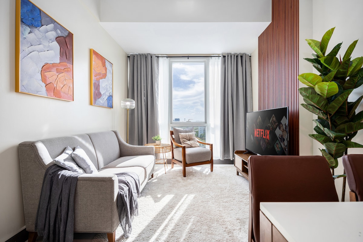 Relax in this entirely cozy, modern and vibrant 1BR condo unit that is conveniently located in ONE MANCHESTER PLACE, Mactan Newtown, Lapu-lapu City. Where it is close to 5 star resorts, restaurants, coffee shops, and supermarket. - 10-15 min drive away from Mactan Airport -Smart Lock Access - 50 Mbps WIFI - Free Netflix - Fully Equipped kitchen (IMPORTANT NOTICE: Kindly review the property descriptions below before making your reservation)