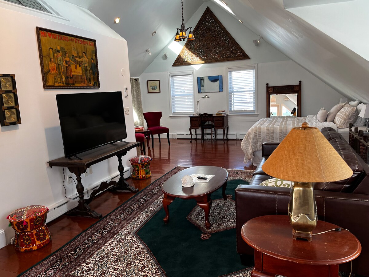 A five minute drive to downtown Newport, and a few minutes walk to Sachuest Beach, this above-garage guesthouse is detached from the main residence with its own private entrance. There is a large living area and a kitchenette, bedroom and bathroom. The living room sofa converts to a bed, so the property is ideal for 2 people, however, the sleep sofa can accommodate 2 more. There is no extra charge for children under the age of 18. We are dog friendly. There's a $25 charge for a second dog.