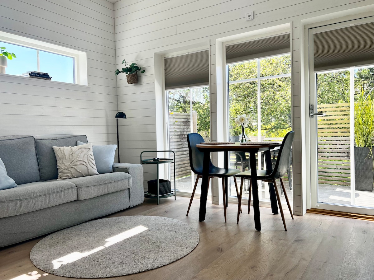 Welcome to our modern guest cottage just a short walk (10 min) to Sweden’s longest sandy beach (12km) This cozy cottage offers comfortable stay for two. Kitchen, bathroom, bedroom, terrace with outdoor furniture and everything you need. Free parking and WiFi CLEANING & BEDLINEN INCLUDED🌺 Walking distance to shoppingcenter, bus stop and summer restaurants. Enjoy long walks, stunning sunsets, and morning dips in the sea. Experience the landscapes, bike and hiking trails. Adventure parks etc.
