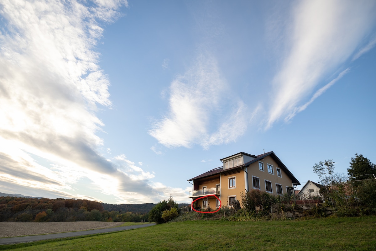 🌻Welcome to our cozy "glamping" apartment. 🐛 It's located in a farmhouse surrounded by greenery. The wild garden, with its variety of flowers, vegetable patches, and hammock, offers a perfect place to unwind. The orchard with Cameroon sheep further enhances your opportunity to spend time undisturbed in nature. The thermal baths are just around the corner, and two swimming lakes are within easy reach. The Zotter Chocolate Factory and Riegersburg Castle are also worth a visit!
