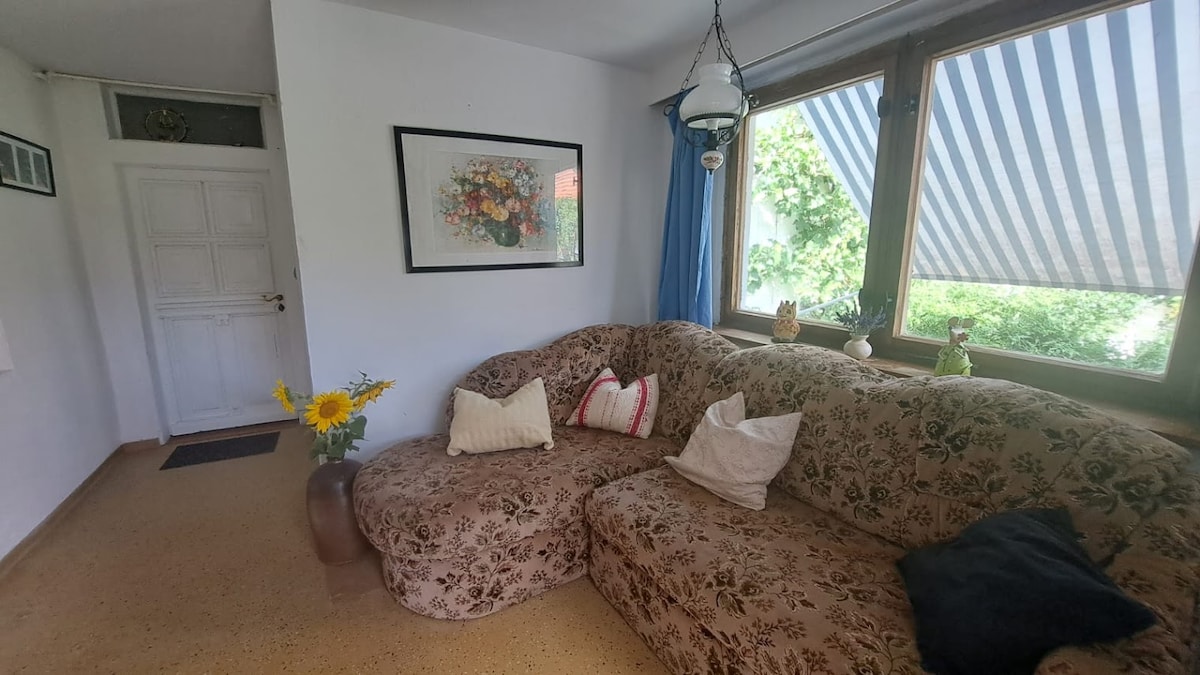 Die Wohnung liegt im Erdgeschoß und ist im Sommer schön kühl. Sie wurde ganz neu saniert und liebevoll ,mit viel Handwerklichem Geschick, von uns selbstgestaltet. Die Holzwerkstatt ist im Haus. (nur als Hobby....es ist kein Lärm zu Erwarten)😉Der Garten ist eine kleine Oase und in ihm befindet sich meine Floristenwerkstatt,die ich gewerblich betreibe. Die Räume der Wohnung sind hell ,geräumig und freundlich . Verdunklungsrollos sind angebracht. Die Küche iist gut bestückt mit allem was man so braucht. Als Gastgeber wohne ich vor Ort und stehe jederzeit bei Fragen zur Verfügung. Bücher und Spiele sind vorhanden.