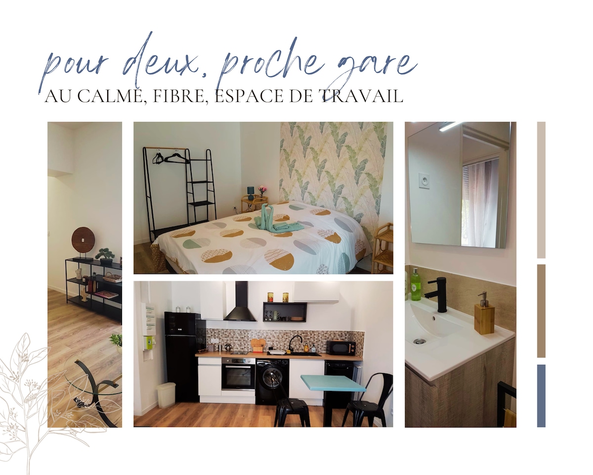 Bienvenue dans notre havre de détente ! Idéalement situé : à deux pas de la gare en plein CENTRE VILLE, notre logement offre une expérience exceptionnelle ! Vous profiterez d'un STATIONNEMENT GRATUIT et facile, pour une commodité sans égale lors de votre séjour. Refait à neuf et équipé de tout le CONFORT pour un séjour privatif ou professionnel (bureau, wifi haut débit, cuisine équipée, douche italienne ... ).