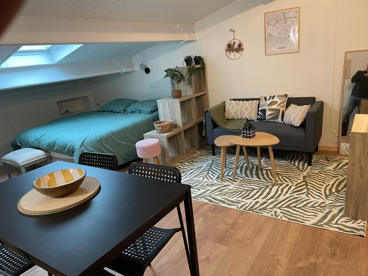 🌿 Charming Nest in the Heart of Niort 🌿 Cozy 20 m² studio with a private garden, loungers and outdoor furniture for relaxing moments. It features a living area with desk and TV (Netflix), a fully equipped kitchen, a separate sleeping area with a 140x190 bed, a modern bathroom with shower, and separate toilets. 🎁 Coffee, tea, bed linen, towels, and high-speed WiFi included. Perfect for a romantic getaway, just steps from shops, restaurants, and downtown activities!