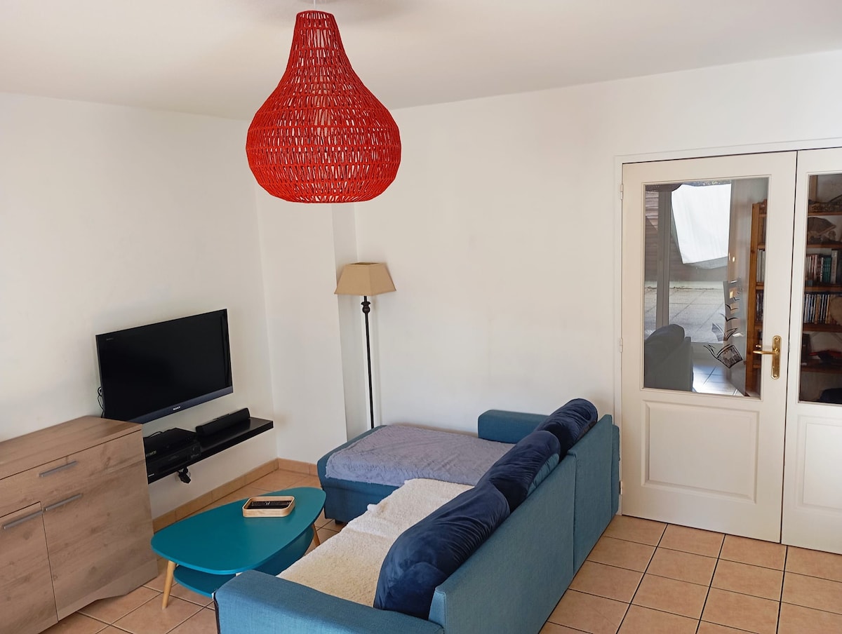 Bienvenue ! Je loue cet appartement qui se situe en rez-de-jardin d'une maison inviduelle dans un lotissement très calme. L'appartement est entièrement équipé et dispose: * Une chambre avec un lit 140 *190 et une armoire * Un salon avec canapé convertible et une TV * Un four, un micro-onde, un frigo avec congélateur, une cafetière filtre et une bouilloire * Une cuisine équipée * Une SDB avec douche en travertin * Un WC indépendant * Une place de parking gratuite * Une terrasse extérieure