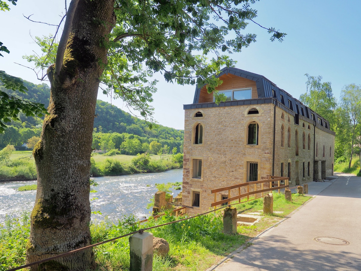 Enjoy a unique location in the heart of nature, between river and bike path. Located in a UNESCO Global Geopark, this old mill was completely renovated in brand new apartments with 1 to 3 bedrooms. Access to a small island behind the mill, where you can relax by the sound of the river. On-site petanque court. On both sides of the river you'll find wonderful cycle paths where you can join the cycle paths of the Sûre, Moselle, Saar, Prüm, Our, Alzette and Kyll rivers.