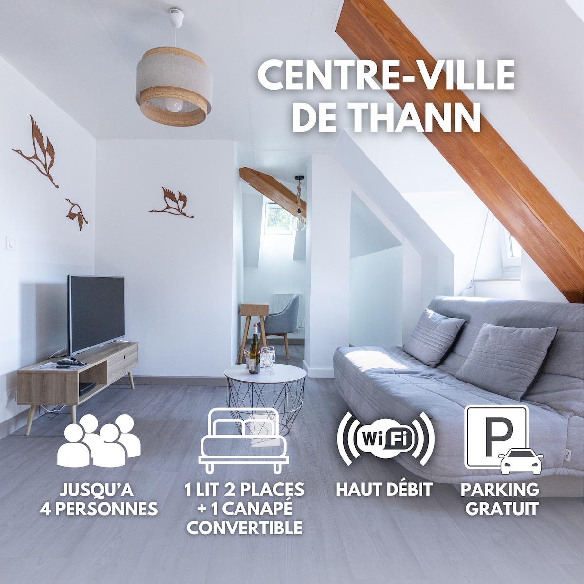 Appartement T2 lumineux situé en plein centre historique de Thann, en Alsace, à l’entrée des Vosges. À 3 minutes à pied de la gare (tram-train vers Mulhouse), idéal pour un séjour sans voiture. WiFi fibre stable et coin bureau dédié pour le télétravail. Point de départ pratique pour randonnées dans les Vosges et découverte de la Route des Vins d’Alsace. Adapté pour un week-end, des vacances d’avril ou un déplacement professionnel.