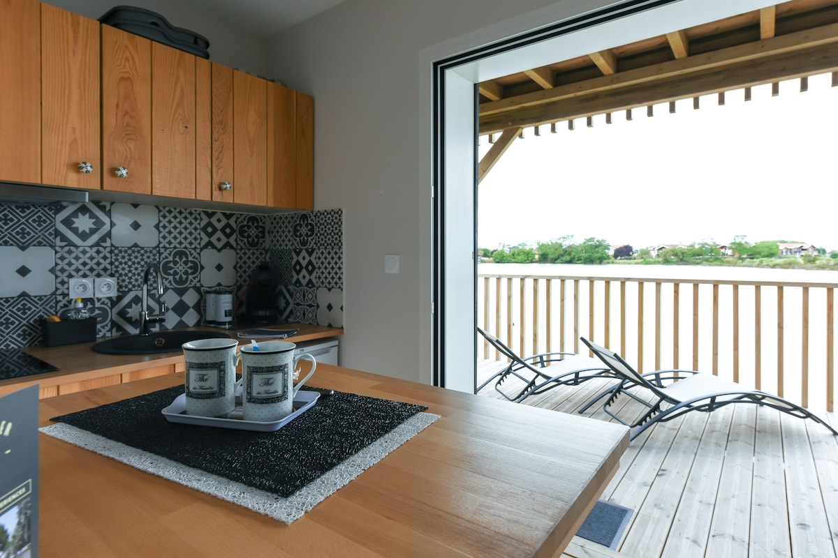 Les pieds dans l'eau, dans l'ambiance pittoresque du PORT DE LARROS (Gujan Mestras), sur le Bassin d'Arcachon, ce studio climatisé au RDC de notre cabane se loue pour 3 à 4 nuits minimum. Equipé pour 2 personnes avec belle terrasse couverte de 22 m2 sur pilotis (sur l'eau) OPTIONS PROPOSEES : • Sortie à la marée. Tarif : 45 euros/pers avec dégustation d'huîtres sur le bateau. . Petit déjeuner continental : 18 euros/personne . Ménage quotidien : 30 euros/jour