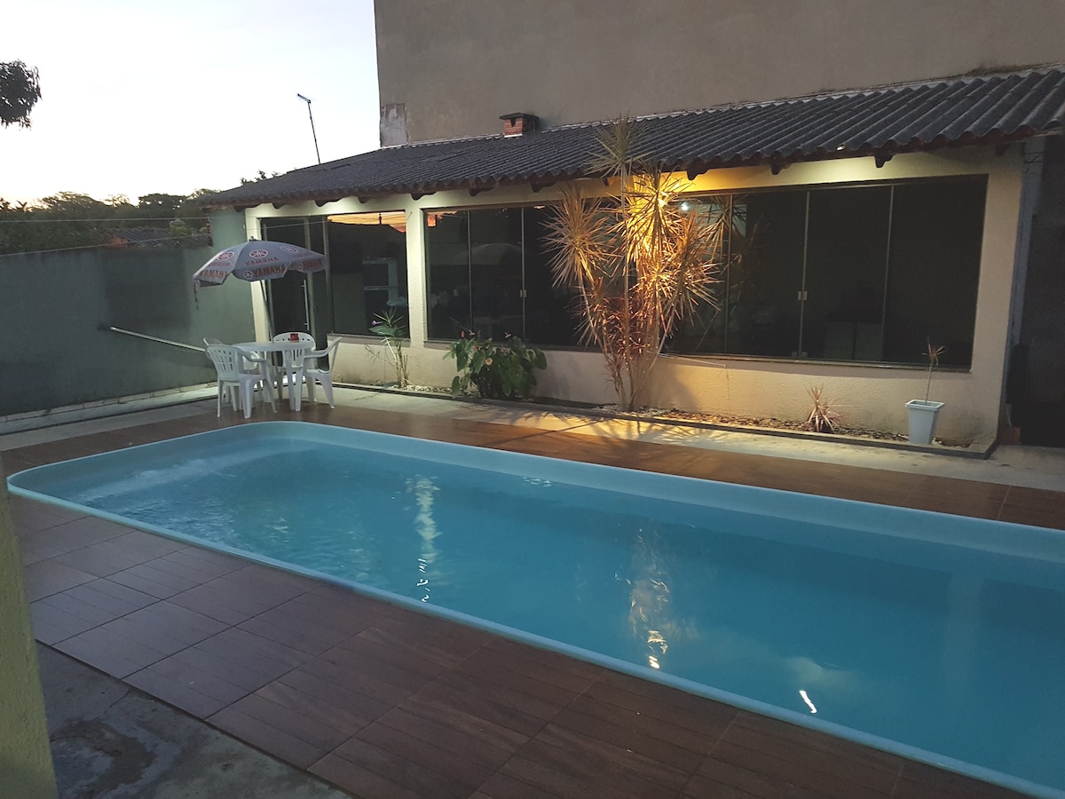 Leve toda a família a este ótimo lugar com muito espaço para seu momento de descanso e laser. Ambiente com 4 suítes e 1 banheiro externo, 4 suítes com ar- condicionado , sala de estar, sala de jantar, edícula com churrasqueira, pia, piscina cozinha completa incluindo geladeira, micro-ondas, forno elétrico, liquidificador, sanduicheira e utensílios necessário. Garagem coberta para 2 carros e espaço aberto para mais 3. OBS: piscina não possui aquecedor
