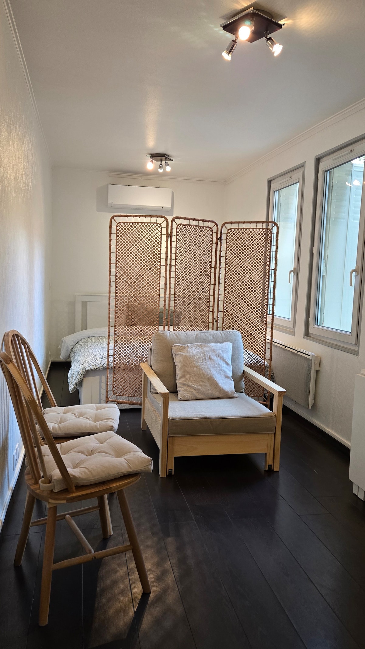 Vous disposerez de l’aile gauche d’une demeure d’un quartier résidentiel du centre-ville, Proche tous commerces, Monoprix, Salle des Ventes. Duplex indépendant de 47 m2 très lumineux, totalement équipé, tout confort. Chambre à l'étage avec terrasse, douche à l’italienne et WC. Vue dégagée sur parc et casino pour les joueurs Grand séjour avec cuisine américaine, salon sous verrière, accessible au travers d’une terrasse de plain pied, et jardin comprenant un emplacement pour deux véhicules.