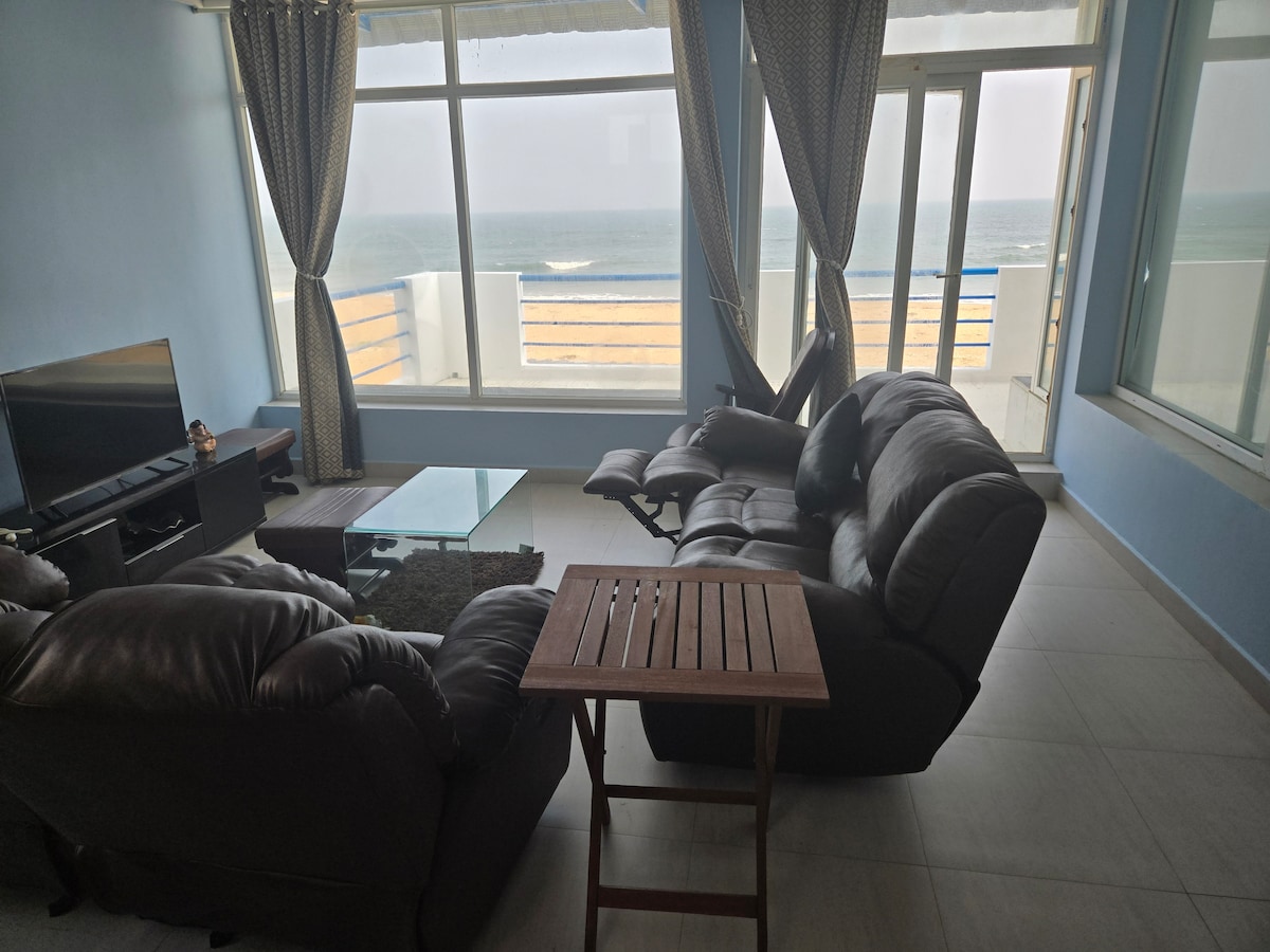 "Escape to a luxurious beachfront house on the fistr floor. The hall and the bedroom have stunning ocean views and if want to experience the beach, you have a private beach access at the back. you can watch ghe Dazzeling Sunrise right from your bed There is a small kitchen with induction stove and a full sized fridge and a large hall with some exclusive leather sofas and a tv. and the highlight is the large and unique bathroom with a large bathtub and the large verandah to relax.