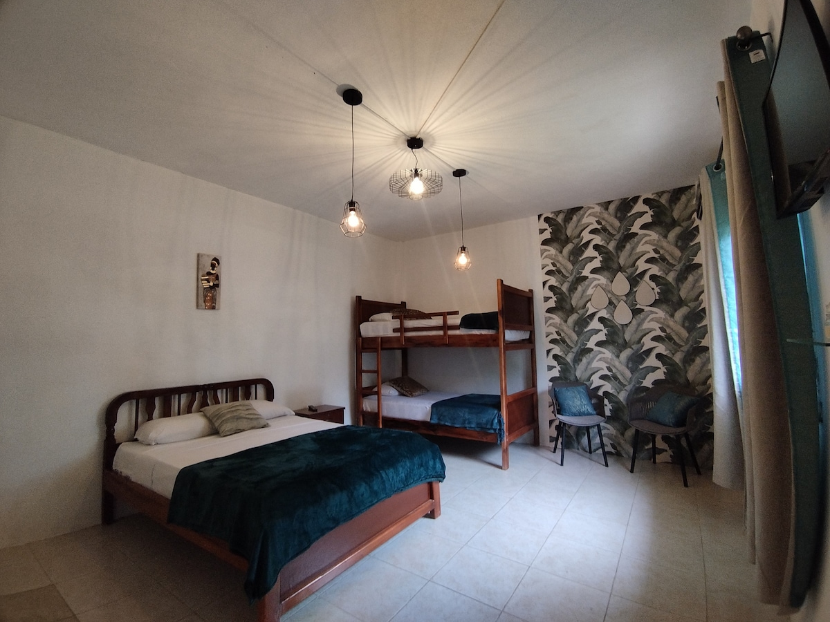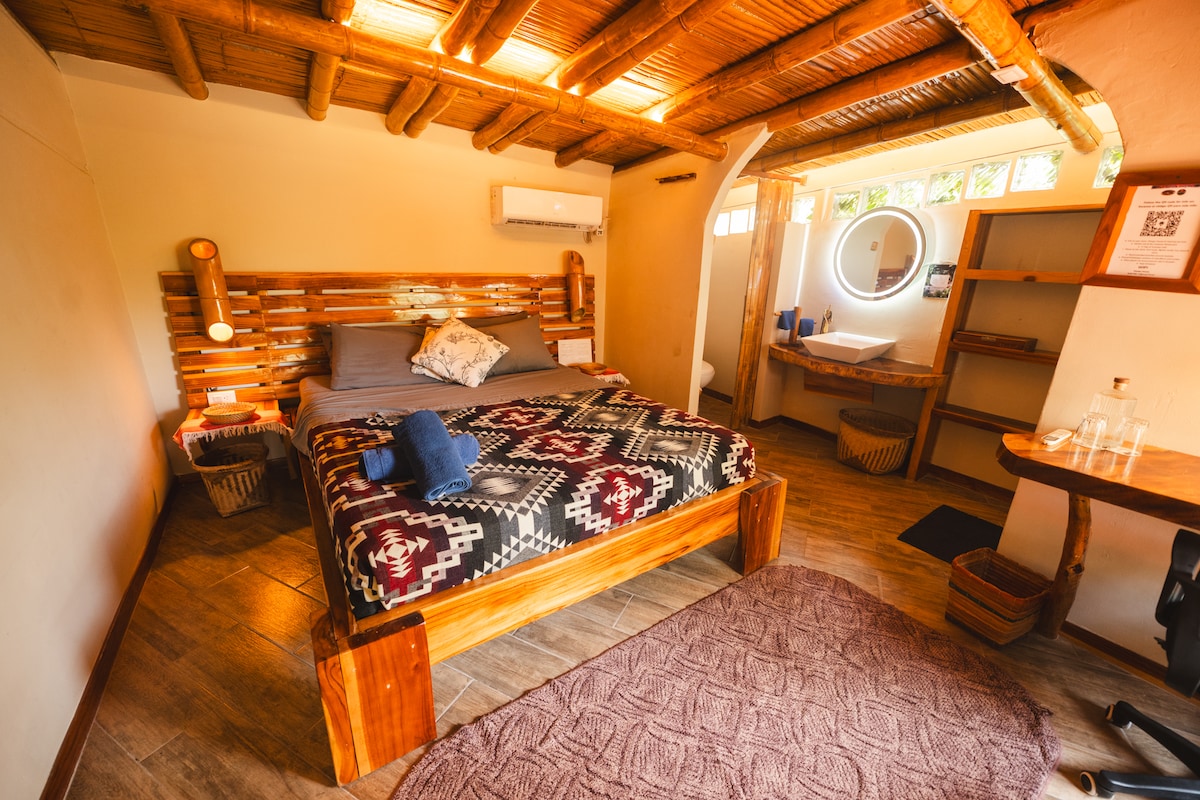 Suite amplia y luminosa ubicada en el 3er priso de la propiedad con cama de 2.5 plazas, baño privado, aire acondicionado, TV con Netflix, mesa y sillas, armario y ventanales con vista al jardín. Sábanas y almohadas de excelente calidad. Acceso a piscina, cocina, parrilla, jardín y cancha de vóley. Edificio tranquilo, seguro y bien ubicado: a solo 5 minutos de la playa y el centro de Montañita. Ideal para quienes valoran el confort, la limpieza y una atención dedicada.