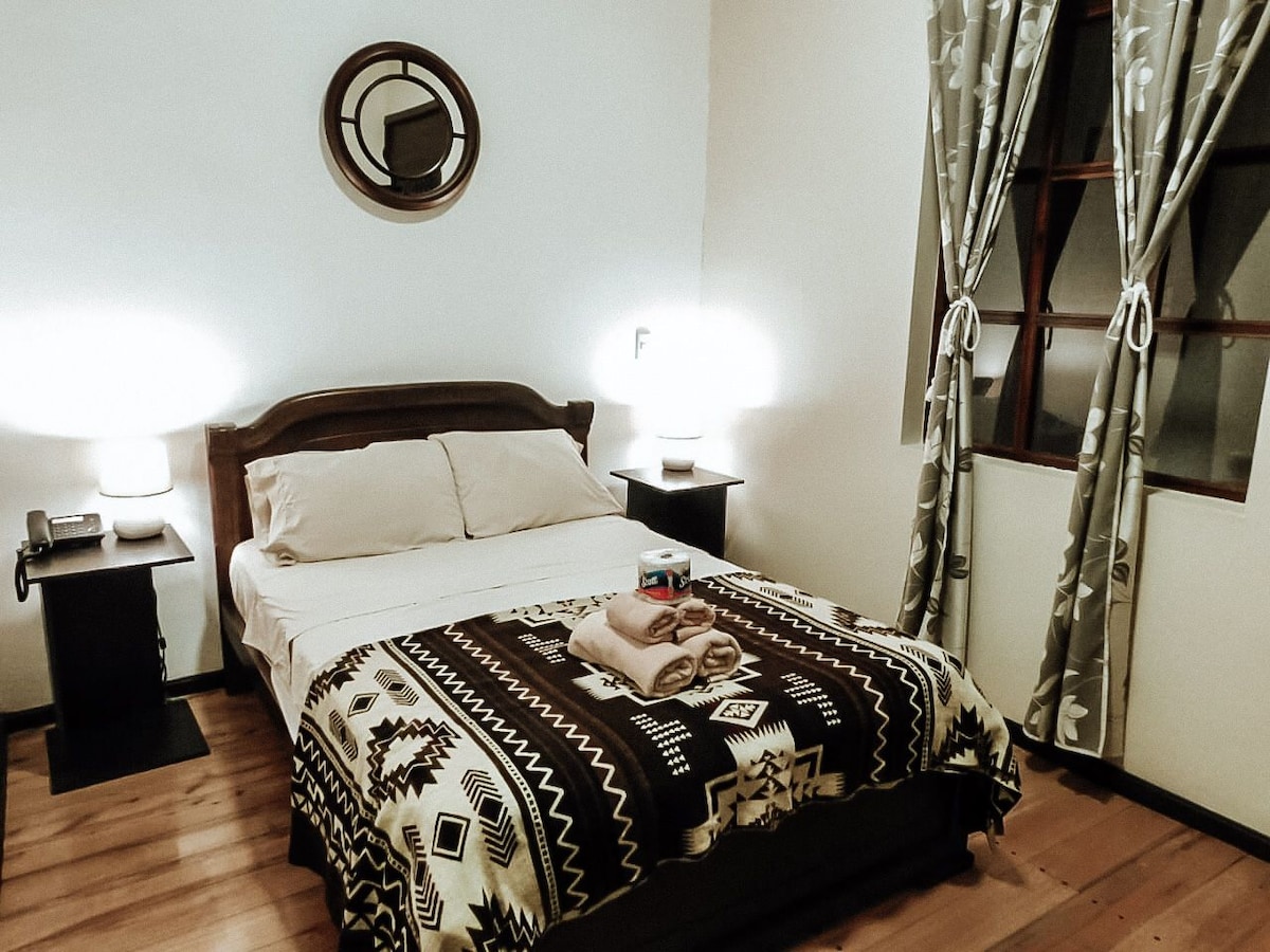 Disfruta de nuestra acogedora suite, ideal para dos personas. Esta habitación cuenta con una cama matrimonial y un baño privado, con una excelente entrada de luz natural que la hace especialmente atractiva. Situada en el corazón de Cuenca, es una opción cómoda y encantadora para tu estancia en la ciudad.