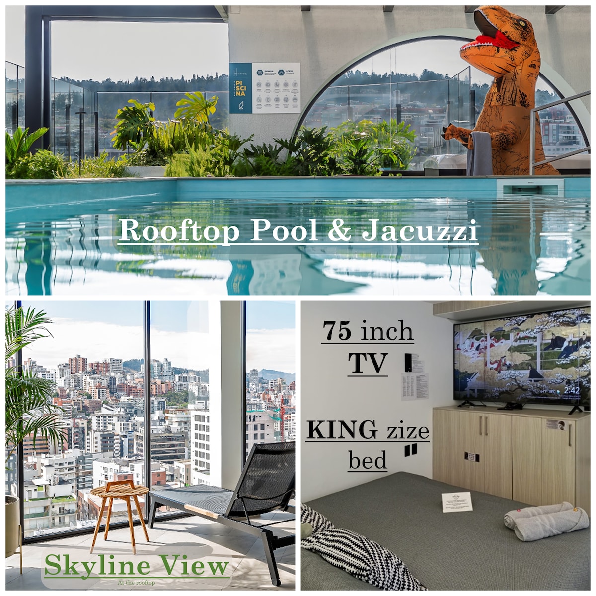 Bienvenido a nuestra maravillosa suite de lujo en el piso 20 de un edificio nuevo y vanguardista! Este oasis en altura está diseñado para brindarle comodidades de primera clase (unas de uso libre y otros previa reserva). Para los amantes de la parrilla, disponemos de un área BBQ con vista 360 a Quito, y aquellos que viajan con sus mascotas estarán encantados de saber que somos pet-friendly. También disponemos de un snack bar con varios productos y bebidas por un pago adicional