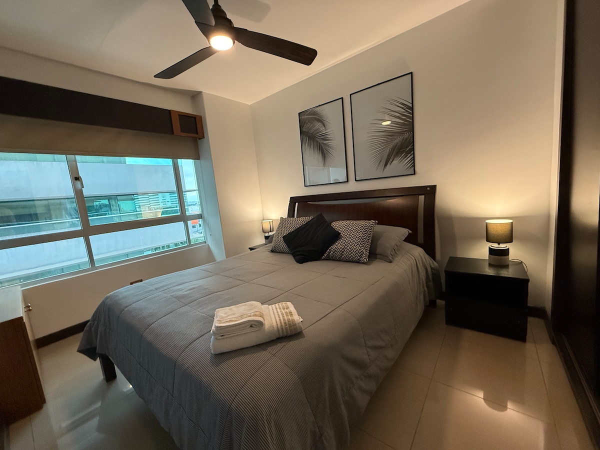 ✅ Hermosa suite en el piso 8 del Edificio River Front #1, con un balcón espectacular y vista panorámica al sector Puerto Santa Ana. 🛏️ Cama King (3 plazas) con sábanas 100 % algodón y sofá cama de 2 plazas, ideal para disfrutar en pareja o familia. 🍳 Cocina equipada, lavadora/secadora, agua caliente, Internet, DirecTV y parqueadero subterráneo. 🏊♂️ El edificio ofrece seguridad 24/7 y amenidades: piscina, jacuzzi, sauna y gimnasio. ✨ A solo 10 minutos del aeropuerto.